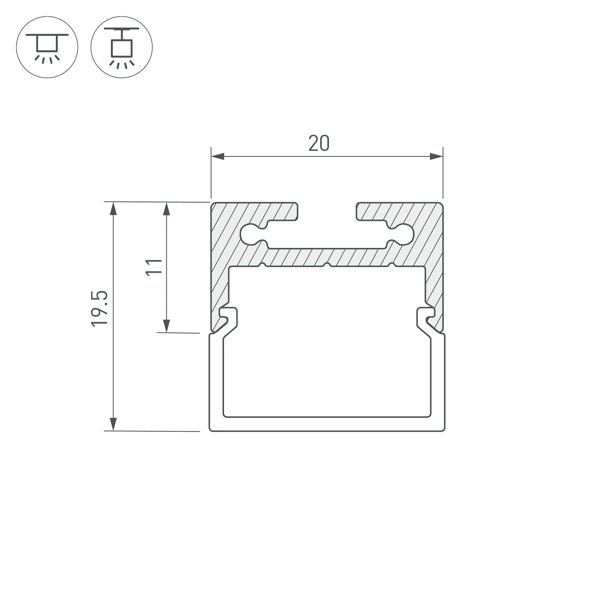 Комплект с экраном и заглушками (2 шт.). Алюминиевый профиль для светодиодных лент и линеек. Цвет - черный RAL9005 (порошковая окраска). Габаритные размеры профиля (L×W×H): 2500x20x11 мм. Габаритные размеры профиля с экраном (L×W×H): 2500x20x20 мм. Ширина площадки для ленты 16,5 мм. Аксессуары приобретаются отдельно.