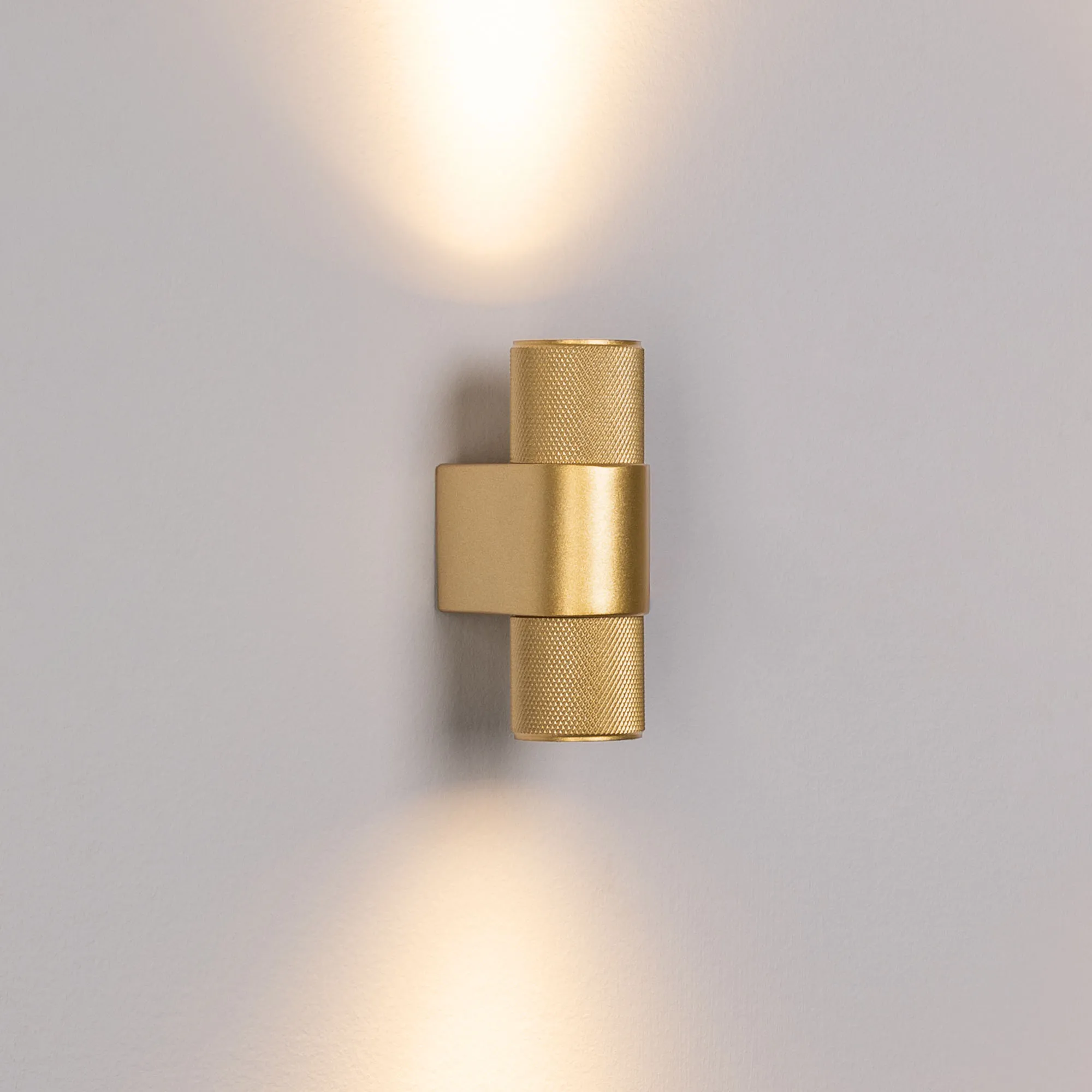 Настенный светильник со свечением в верхнюю и нижнюю полусферу. Мощность 6 Вт, св. поток 350 лм, 60 лм/Вт, теплый 3000 K, CRI>90, угол 40°, напряжение питания 230 В. Золотой фигурный корпус из алюминия, степень защиты IP20. Размер: длина 60 мм, ширина 38,5 мм, высота 104 мм. Монтаж накладной. Драйвер 5-9 В, 700 мА, пульсация <1%.