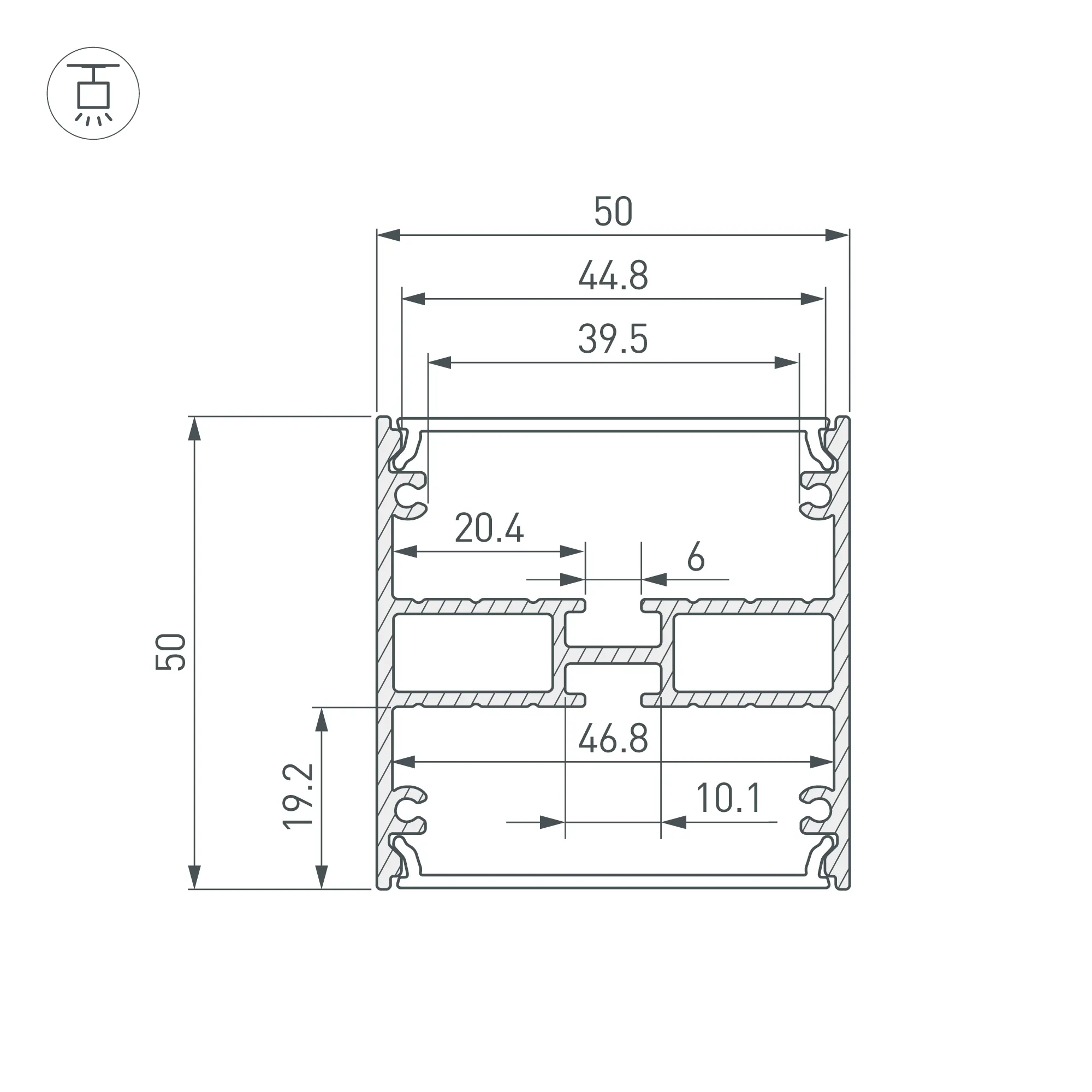 Алюминиевый анодированный профиль для светодиодных лент и линеек, свечение вверх и вниз. Габаритные размеры (L×W×H): 2000x50x50 мм. Ширина площадок для ленты 46,8 мм. Экраны, заглушки и другие аксессуары приобретаются отдельно. Цена за 1 метр.