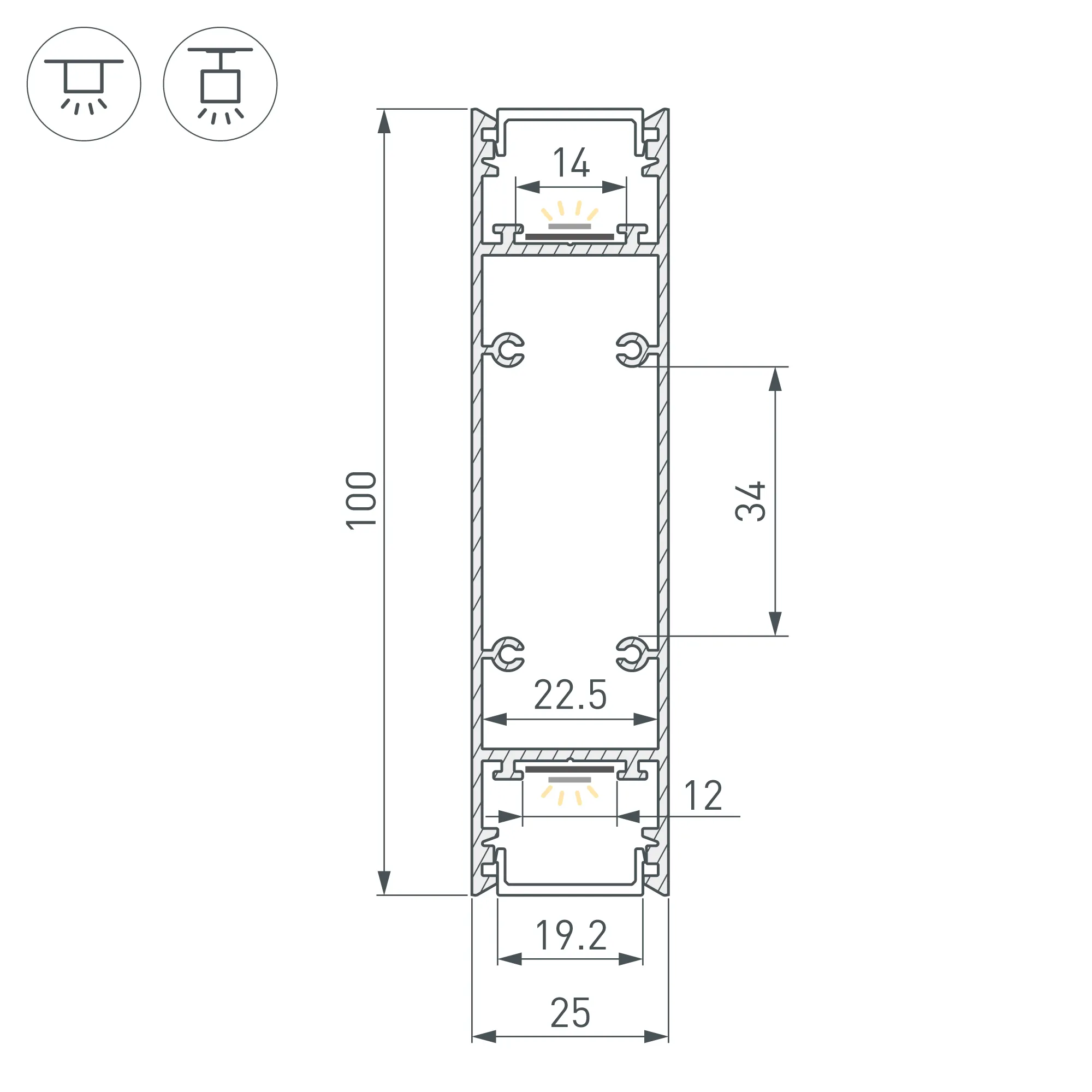 Под заказ от 100 м. Алюминиевый профиль для светодиодных лент и линеек, свечение вверх и вниз. Цвет - шампань розовый (порошковая окраска). Габаритные размеры (L×W×H): 2500x25x100 мм. Ширина площадки для ленты 12 мм. Экраны, заглушки и другие аксессуары приобретаются отдельно. Цена за 1 метр.