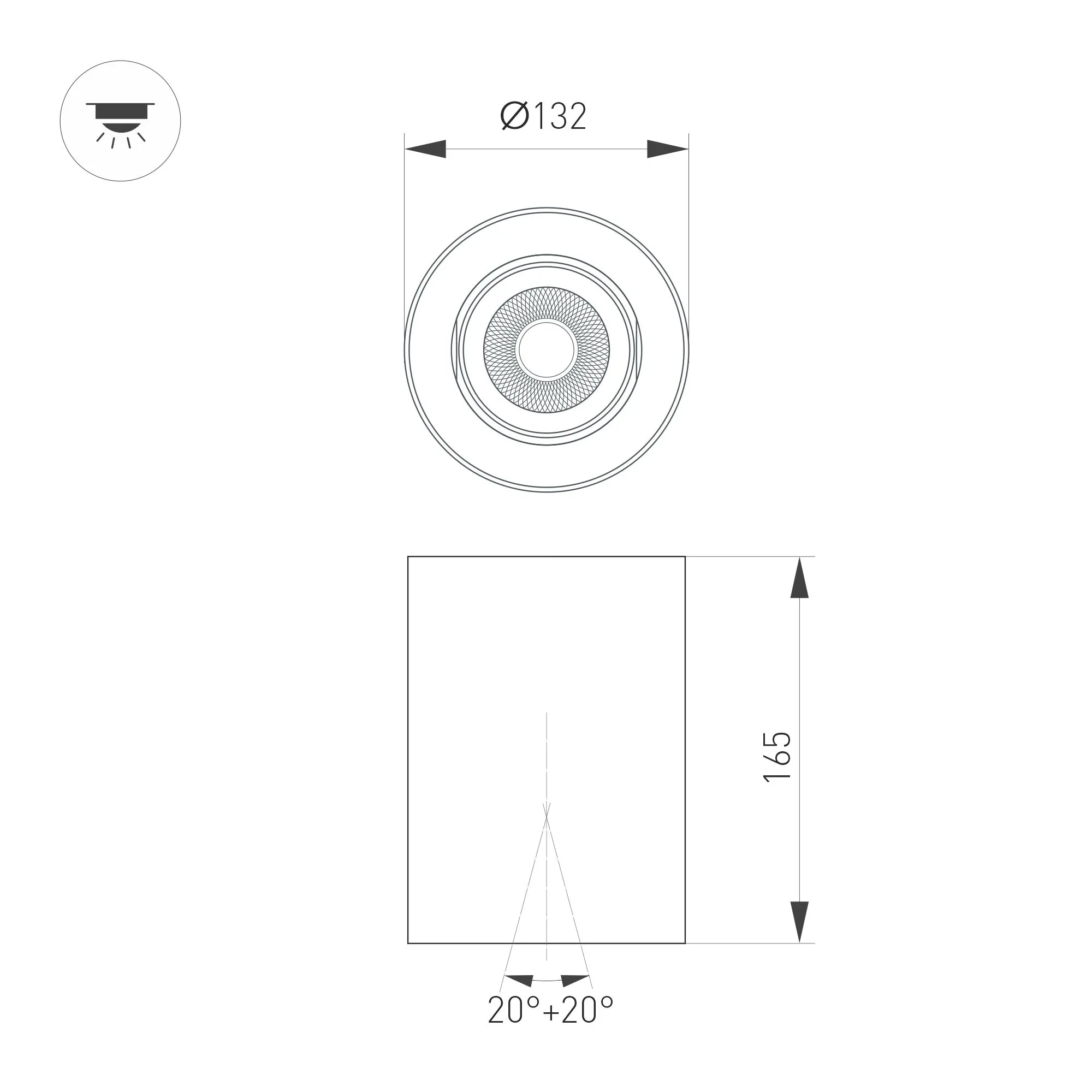 Накладной интерьерный светильник. Мощность 24 Вт, св. поток 2400 лм, 99 лм/Вт, дневной 4000 K, CRI>90, угол 24°, регулируемое направление луча 40°(20+20), поворотный световой модуль вокруг своей оси на 340°, UGR <11, напряжение питания 230 В. Чёрный круглый корпус из алюминия, степень защиты IP54. Размер: диаметр 132 мм, высота 165 мм. Монтаж накладной. Драйвер 27-45 В, 600мА, пульсация <1%.