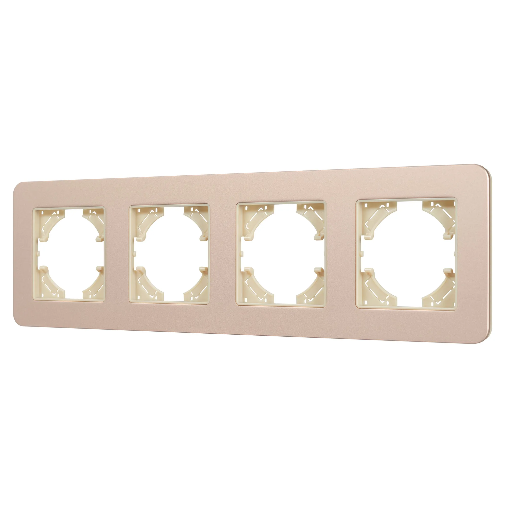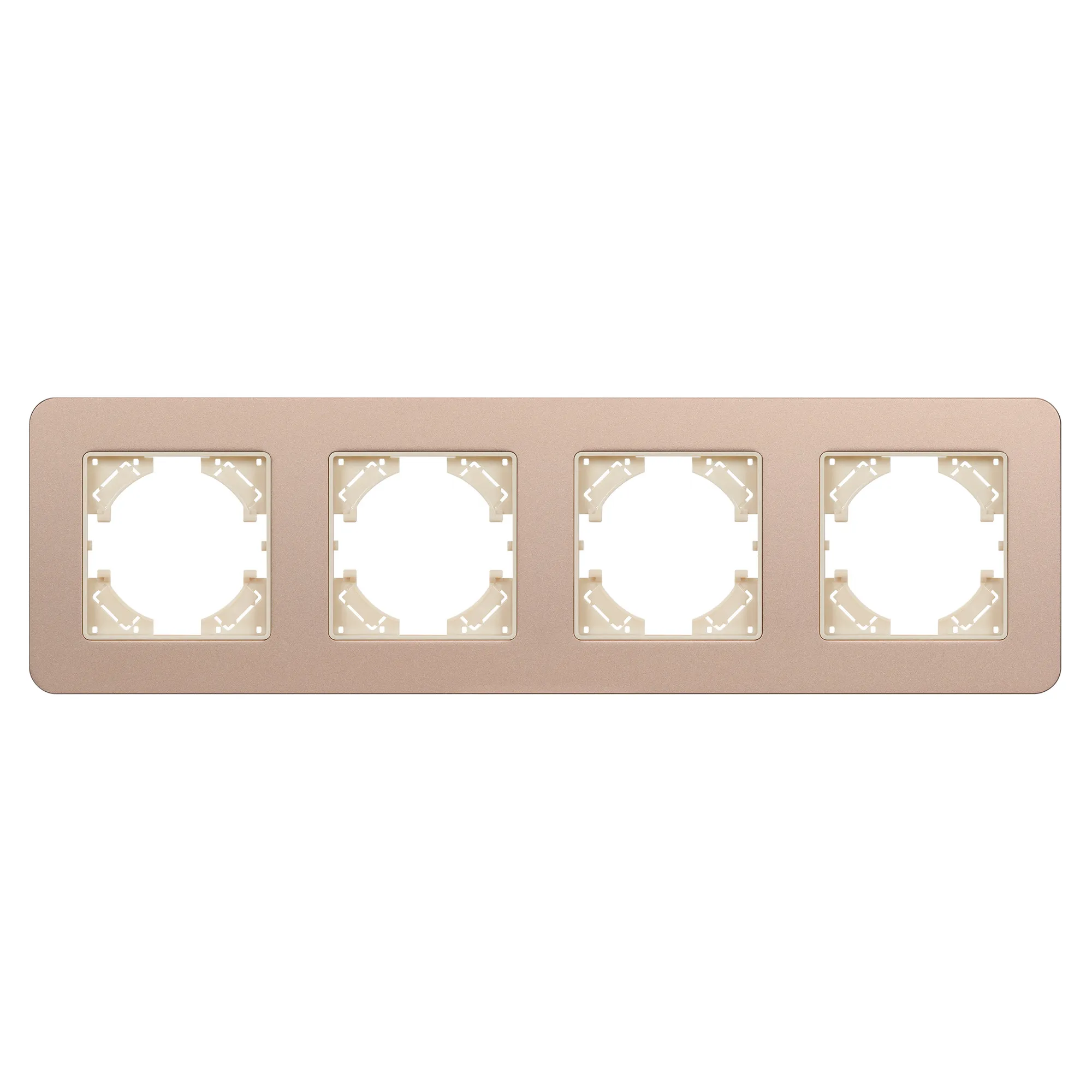 Рамка алюминиевая на 4 поста, под встраиваемый механизм. Цвет - золотой с Soft-Touch покрытием. Уровень герметичности IP20. Ориентация монтажа - горизонтальная (основным ориентиром служат посадочные выступы для накладки механизма). Габаритные размеры: длина 299 мм, ширина 86 мм, высота 7 мм. Гарантийный срок 12 мес.