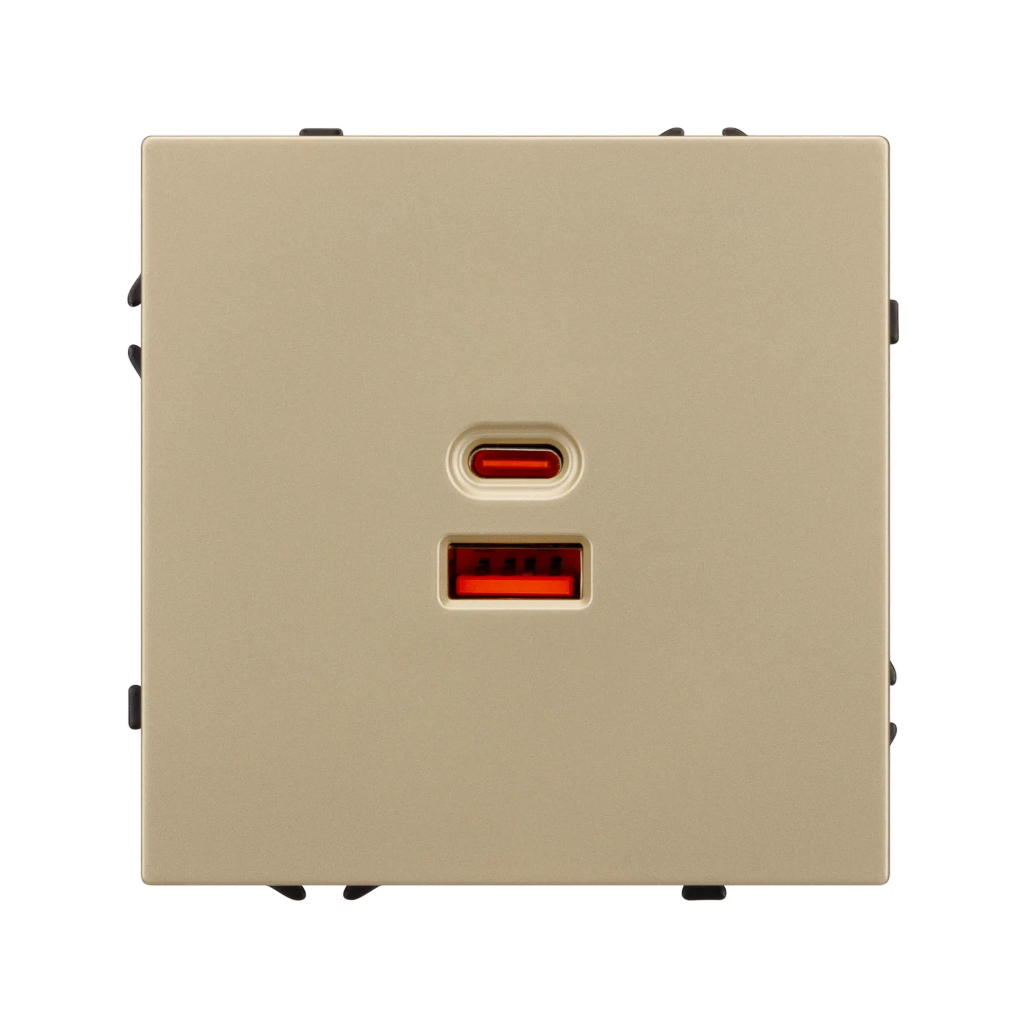 Механизм розетки с быстрой USB зарядкой на 2 порта. Цвет - золотой песок, с Soft-Touch покрытием. Без фронтальной рамки. Уровень пылевлагозащиты IP20. Тип подключаемого разъема - USB Type A + Type C. Устанавливается в стандартный подрозетник круглого сечения диаметром 60мм.